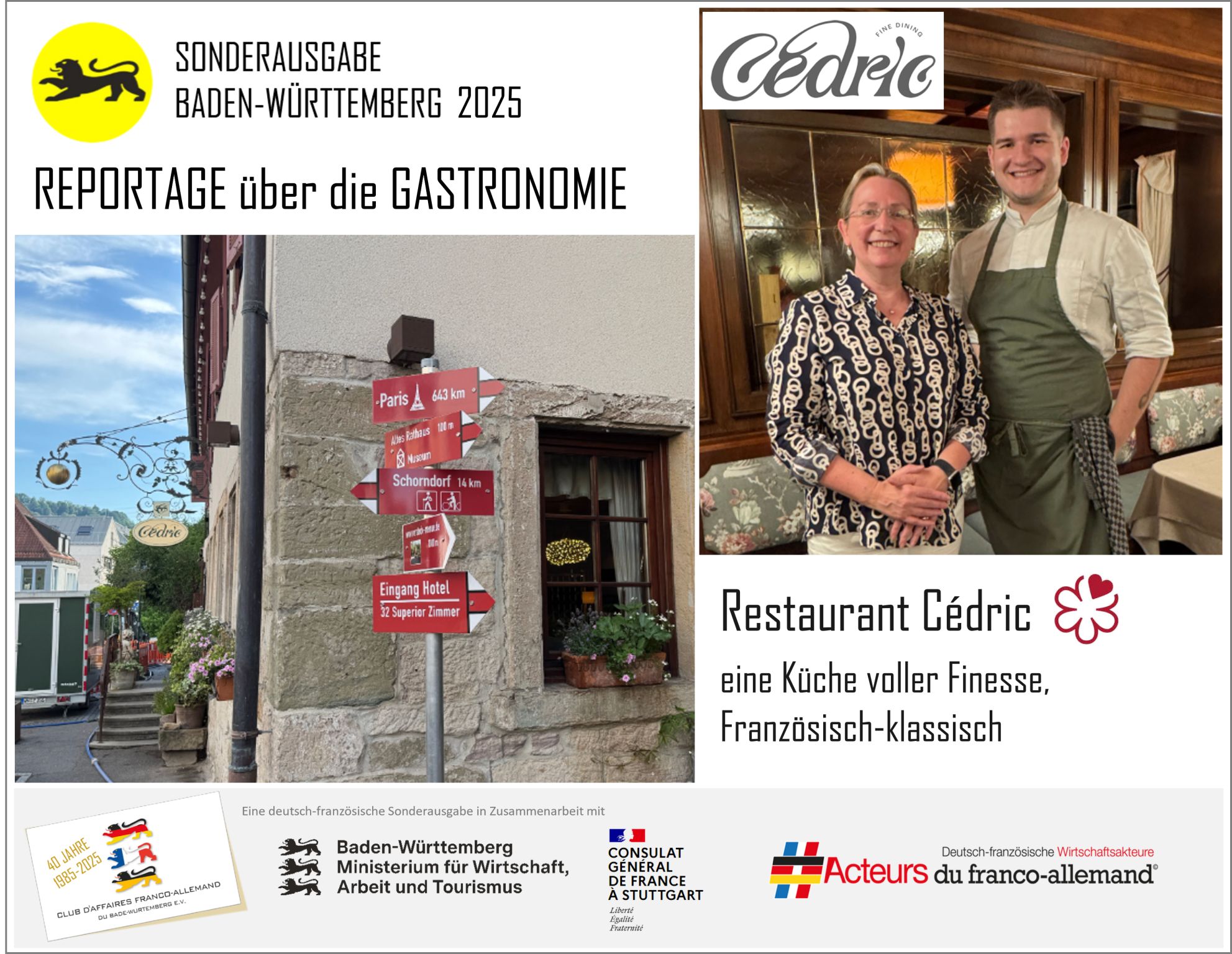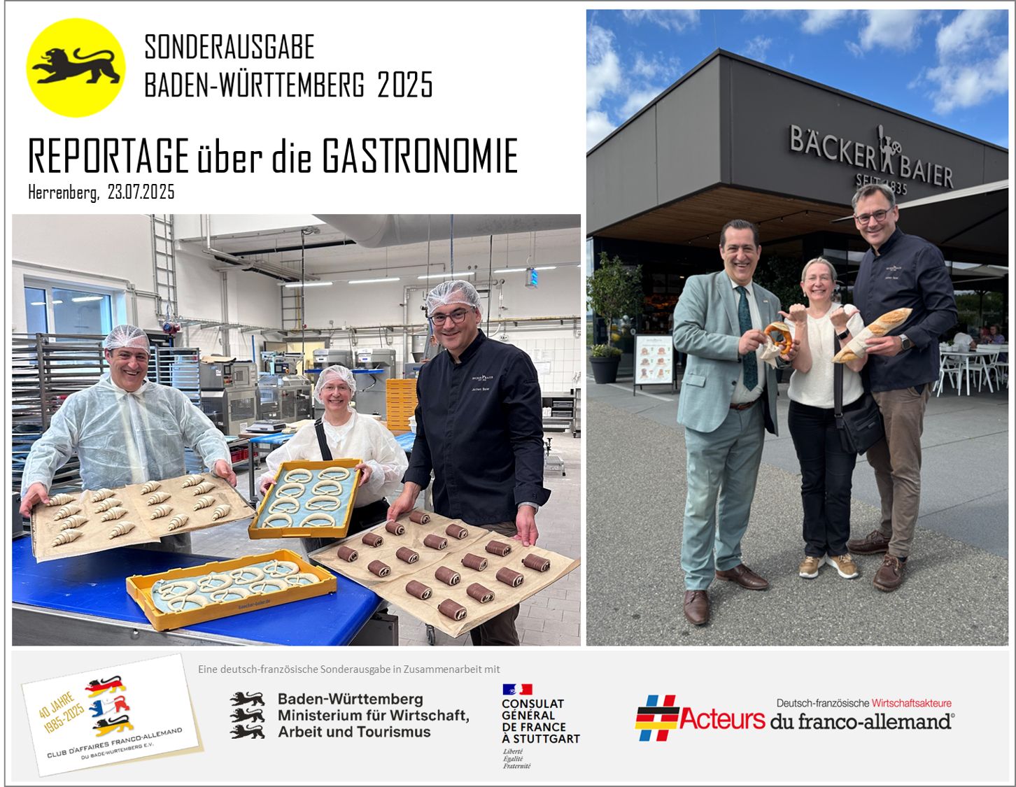 Im Rahmen der Reportage über die Gastronomie in Baden-Württemberg fand am 23. Juli ein Treffen zwischen der Präsidentin des Wirtschaftsclubs, Céline Eheim, dem französischen Generalkonsul für Baden-Württemberg, Gaël de Maisonneuve, und Jochen Baier, dem Genussbotschafter des Landes Baden-Württemberg, statt. Jochen Baier leitet das 1835 gegründete Familienunternehmen Bäcker Baier in der sechsten Generation.
