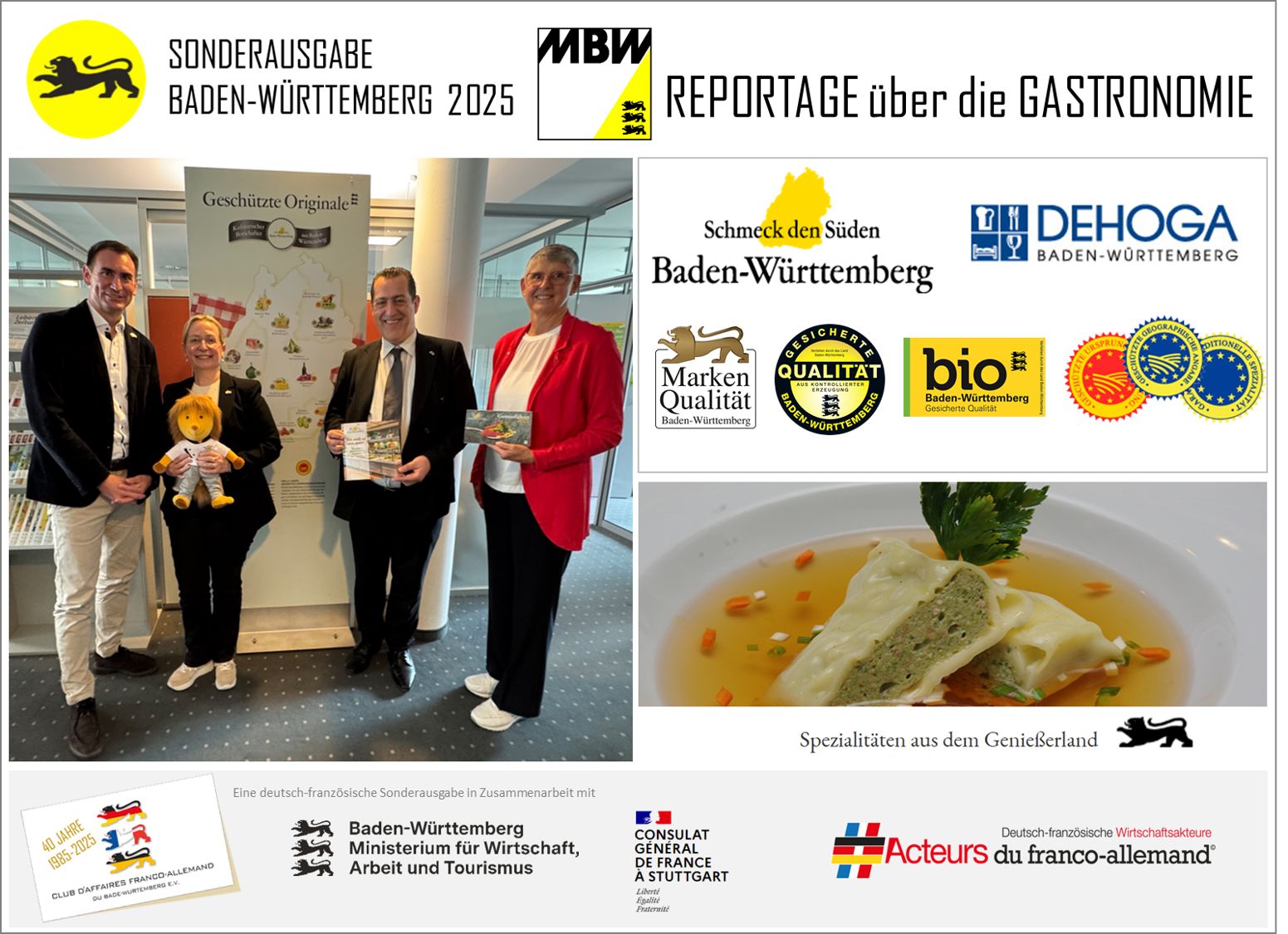 Im Rahmen der Reportage über die Gastronomie in Baden-Württemberg fand heute ein Treffen zwischen der Präsidentin des Wirtschaftsclubs, Céline Eheim, dem französischen Generalkonsul für Baden-Württemberg, Gaël de Maisonneuve, Falk Kullen, Geschäftsführer von MBW & Markenbotschafter mit dem DEHOGA Baden-Württemberg, vertreten durch Frau Regina Autenrieth, statt.