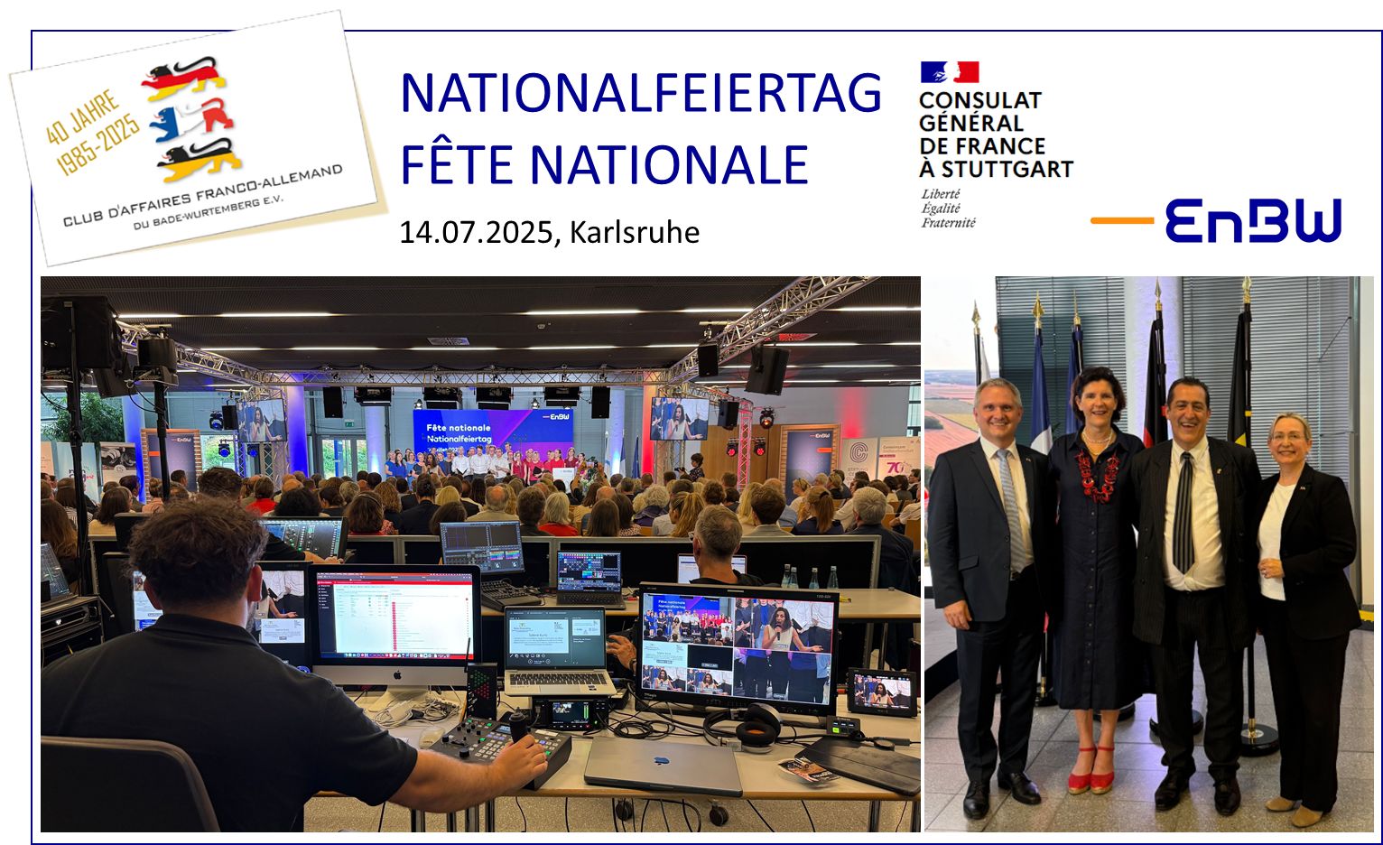 Der Club d´affaires franco-allemand du Bade-Wurtemberg e.V., vertreten durch seine beiden Präsidenten Céline Eheim und Jörg Luft, feierte den 14. Juli 2025 bei EnBW Energie Baden-Württemberg AG in Karlsruhe mit zahlreichen Gästen.