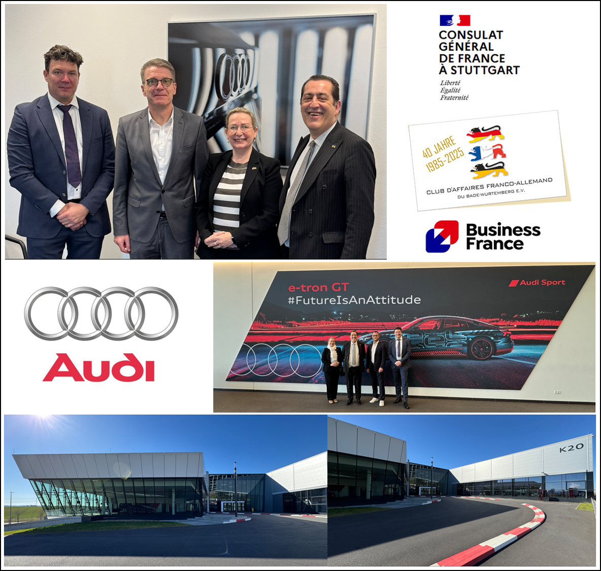 Im Rahmen unserer Reihe von Besuchen bei deutschen Unternehmen, die auf dem französischen Markt tätig sind, begleitete die Präsidentin des Club d´affaires franco-allemand du Bade-Wurtemberg e.V., Céline Eheim, Gaël de Maisonneuve, den französischen Generalkonsul für Baden-Württemberg, und Stéphane Laaper - Business France Invest zum Automobilhersteller AUDI AG in Neckarsulm im Norden des Bundeslandes Baden-Württemberg.