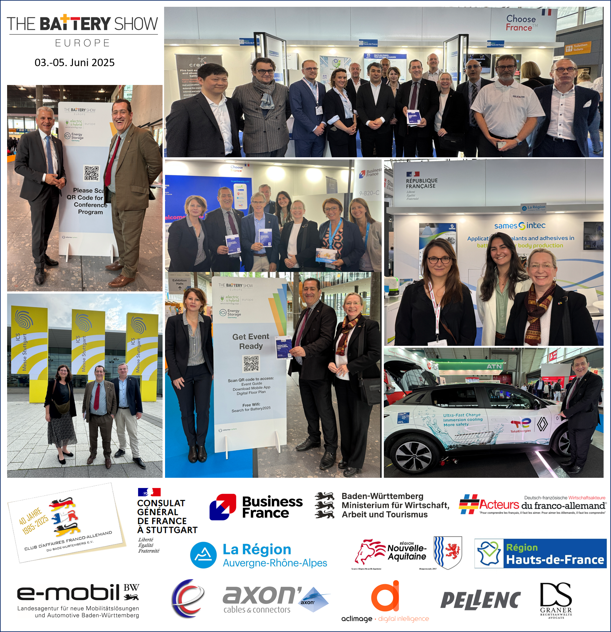 Unter dem Motto „Allein ist gut, gemeinsam sind wir stärker!...“ wird das France Export Team (Business France Deutschland, Deutsch-Französischer Wirtschaftsclub Baden-Württemberg e.V., CCE - Deutschland, Bpifrance) auf der The Battery Show Europe 2025 vertreten sein, die vom 03. bis 05. Juni 2025 in Stuttgart stattfindet und durch die Anwesenheit zahlreicher französischer Aussteller geprägt sein wird.