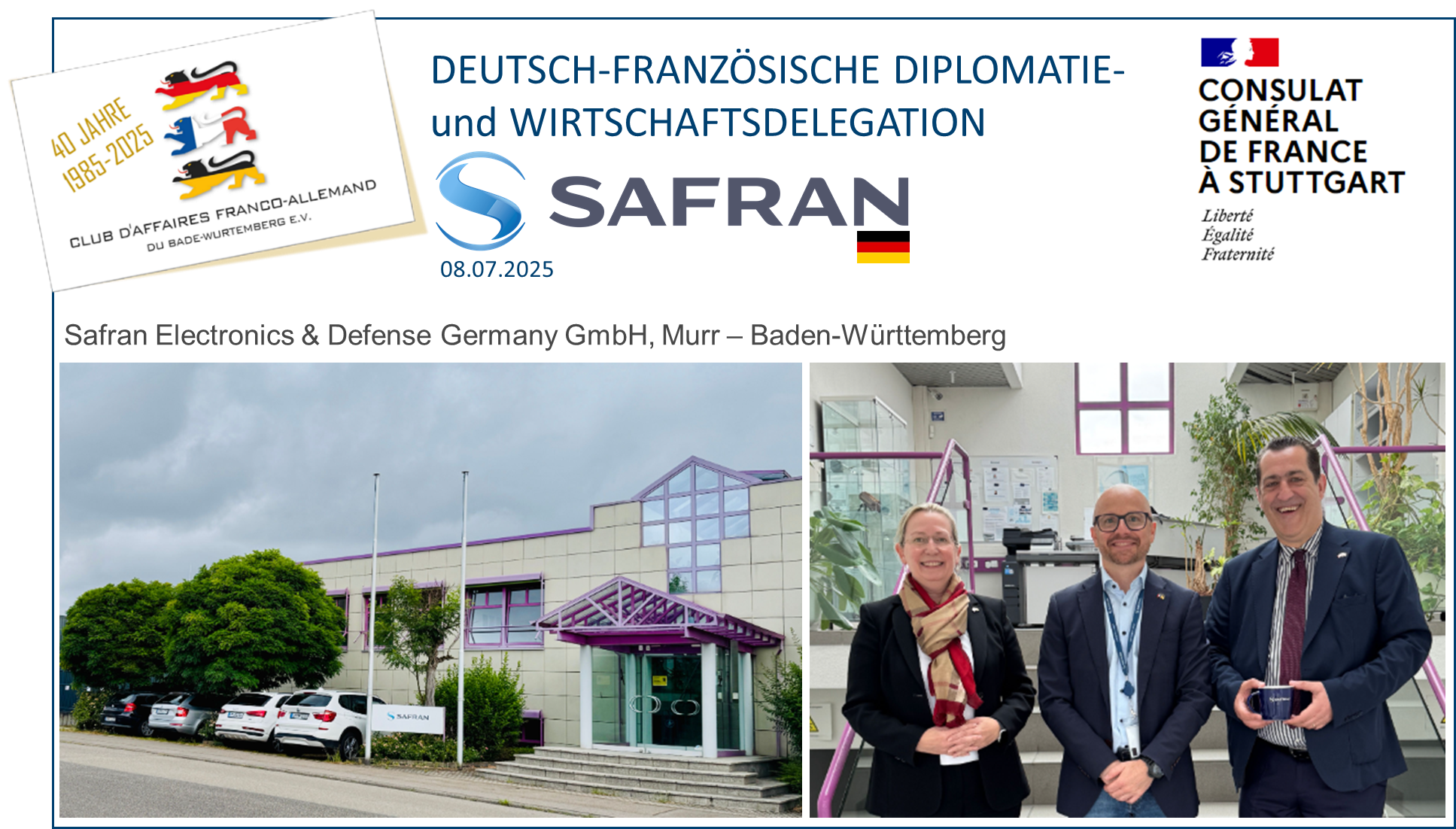 In unserer Reihe von Besuchen deutscher Unternehmen mit französischen Wurzeln besuchte der Wirtschaftsclub, vertreten durch seine Co-Präsidentin Céline Eheim und in Begleitung des französischen Generalkonsuls für Baden-Württemberg, Gaël de Maisonneuve, die Safran Electronics & Defense Germany GmbH in Murr.