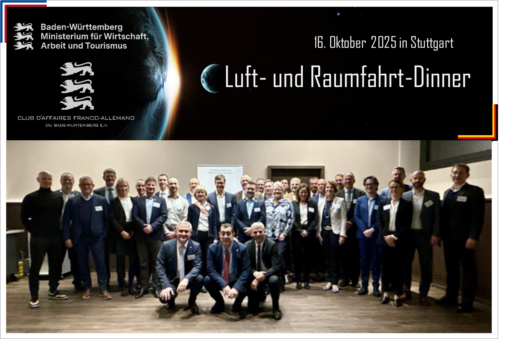 Staatssekretär Dr. Patrick Rapp, Mitglied des Landtags, Ministerium für Wirtschaft, Arbeit und Tourismus Baden-Württemberg, Céline Eheim und Jörg Luft, Vorsitzende des Club d´affaires franco-allemand du Bade-Wurtemberg e.V., freuten sich besonders, deutsch-französische Unternehmen (Airbus Defence and Space, Diehl Defence, TESAT, SACS Aerospace GmbH, Safran, Bertrandt Group, Dassault Systèmes, ArianeGroup, Thales, Bechtle, CENIT AG, ATMOS Space Cargo, Axon' Cable Germany, MIMplus Technologies GmbH & Co. KG , wichtige Forschungsakteure wie IMS CHIPS German, Institutes of Textile and Fiber Research, Fraunhofer IPA, Fraunhofer EMI, German Aerospace Center (DLR) Stuttgart oder die University of Stuttgart und die Bank BNP Paribas CIB zu einem Dinner zum Thema Luft- und Raumfahrt in Stuttgart einzuladen.