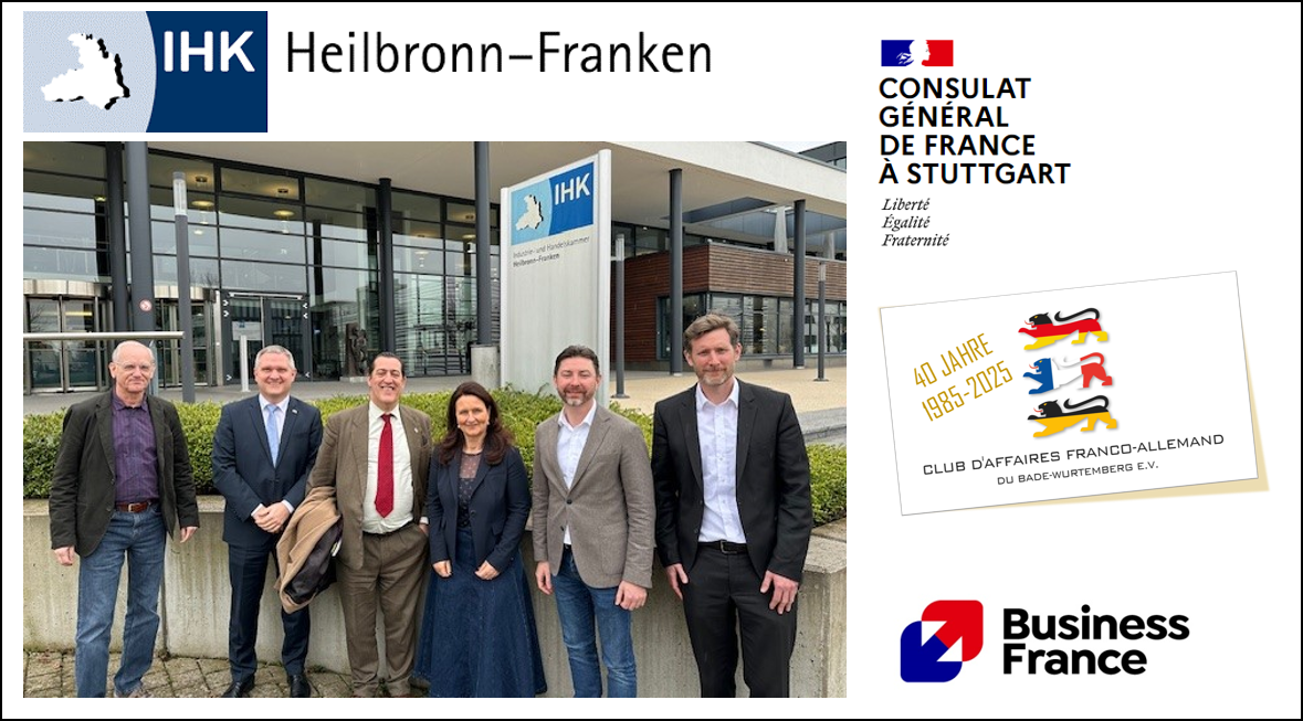 Im Rahmen unserer deutsch-französischen Diplomatie- und Wirtschaftsdelegationsbesuche mit unserem Schirmherrn Gaël de Maisonneuve, Generalkonsul von Frankreich für Baden-Württemberg, und Alexandre Kühl von Business France Deutschland war Jörg Luft, Co-Präsident des Club d´affaires franco-allemand du Bade-Wurtemberg e.V. am 13. März 2025 bei der Industrie- und Handelskammer Heilbronn-Franken.