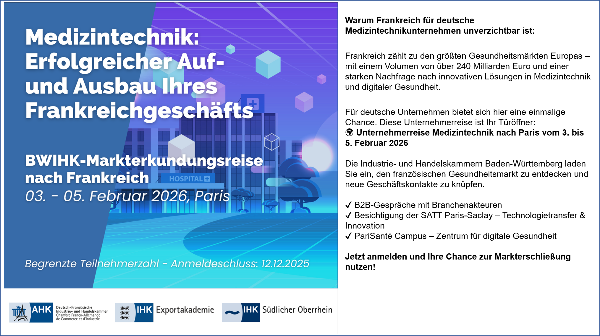 Im Fokus steht der französische Medizintechnikmarkt – einer der dynamischsten und innovativsten Gesundheitsmärkte Europas. Diese dreitägige Unternehmerreise bietet deutschen Unternehmen die Möglichkeit, neue Geschäftskontakte zu knüpfen, Marktwissen zu vertiefen und Kooperationspotenziale zu erschließen.