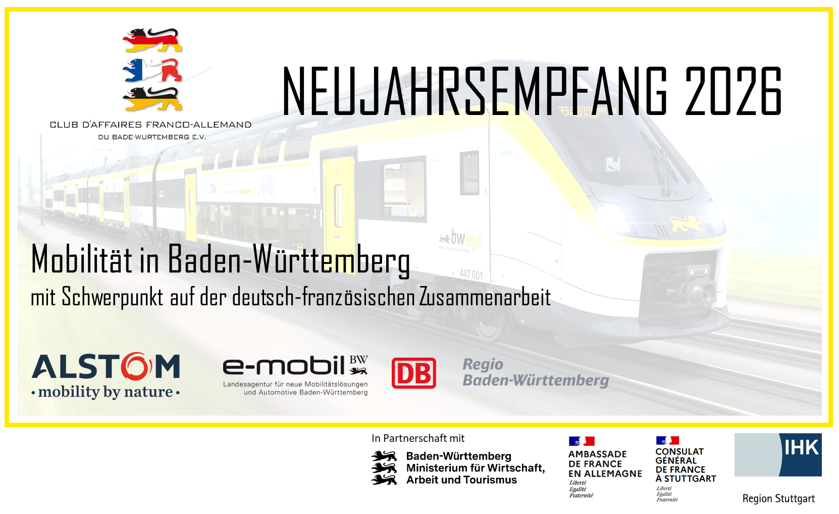 En collaboration avec le ministère de l'Économie, du Travail et du Tourisme du Bade-Wurtemberg, l'ambassade de France en Allemagne et le consulat général de France dans le Bade-Wurtemberg, nous vous invitons à notre RÉCEPTION DU NOUVEL AN 2026 à la CCI de la région de Stuttgart sur le thème « La mobilité dans le Bade-Wurtemberg avec un accent particulier sur la coopération franco-allemande ».
