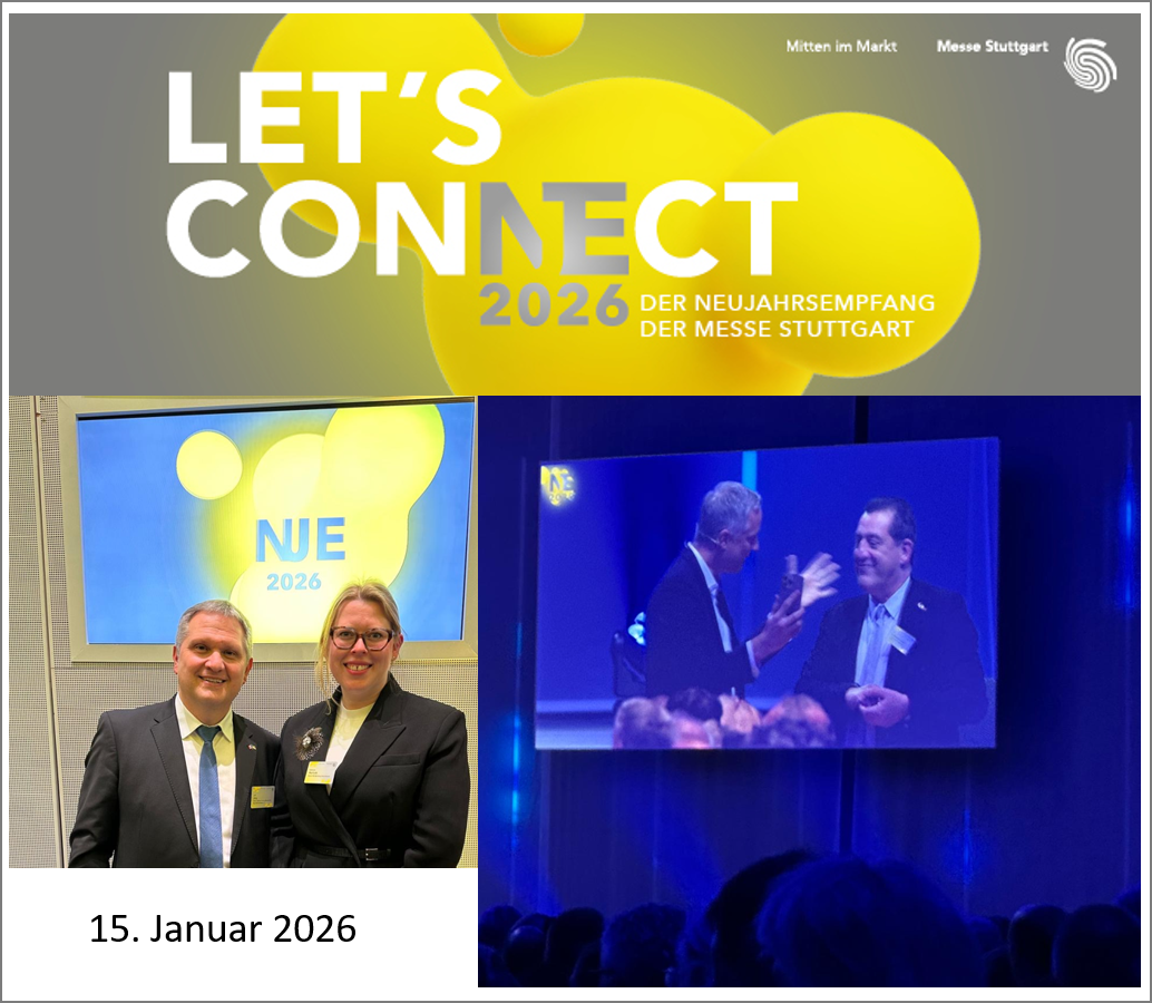 Le soir du 15 janvier 2026, le Club d'affaires franco-allemand du Bade-Wurtemberg e.V. a eu le plaisir de participer, en compagnie de notre parrain, le consul général de France Gaël de Maisonneuve, à la réception du Nouvel An organisée par la Landesmesse Stuttgart à l'ICS, aux côtés d'environ 1 800 invités issus des milieux économiques, politiques et de la société civile.