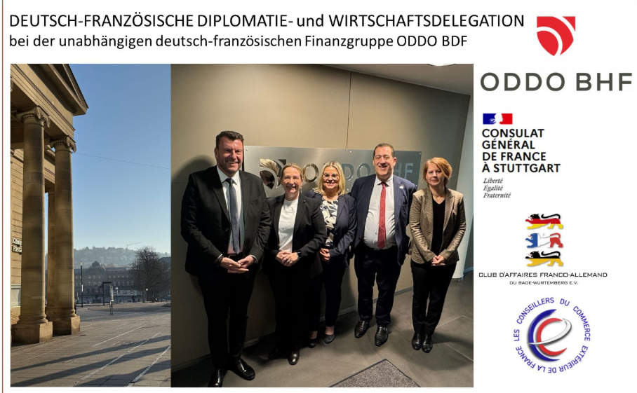 À l'approche de l'anniversaire du Traité de l'Élysée (22 janvier) et à l'occasion de notre première visite économique diplomatique de 2026 avec Gaël de Maisonneuve, consul général de France pour le Bade-Wurtemberg, Céline Eheim, présidente du Club d'affaires franco-allemand du Bade-Wurtemberg e.V., et Sandrine Kirschenbilder, présidente de la section Bade-Wurtemberg du CCE - Allemagne, section Bade-Wurtemberg, rien de mieux que de rencontrer un acteur majeur des relations franco-allemandes tel que le groupe financier ODDO BHF.